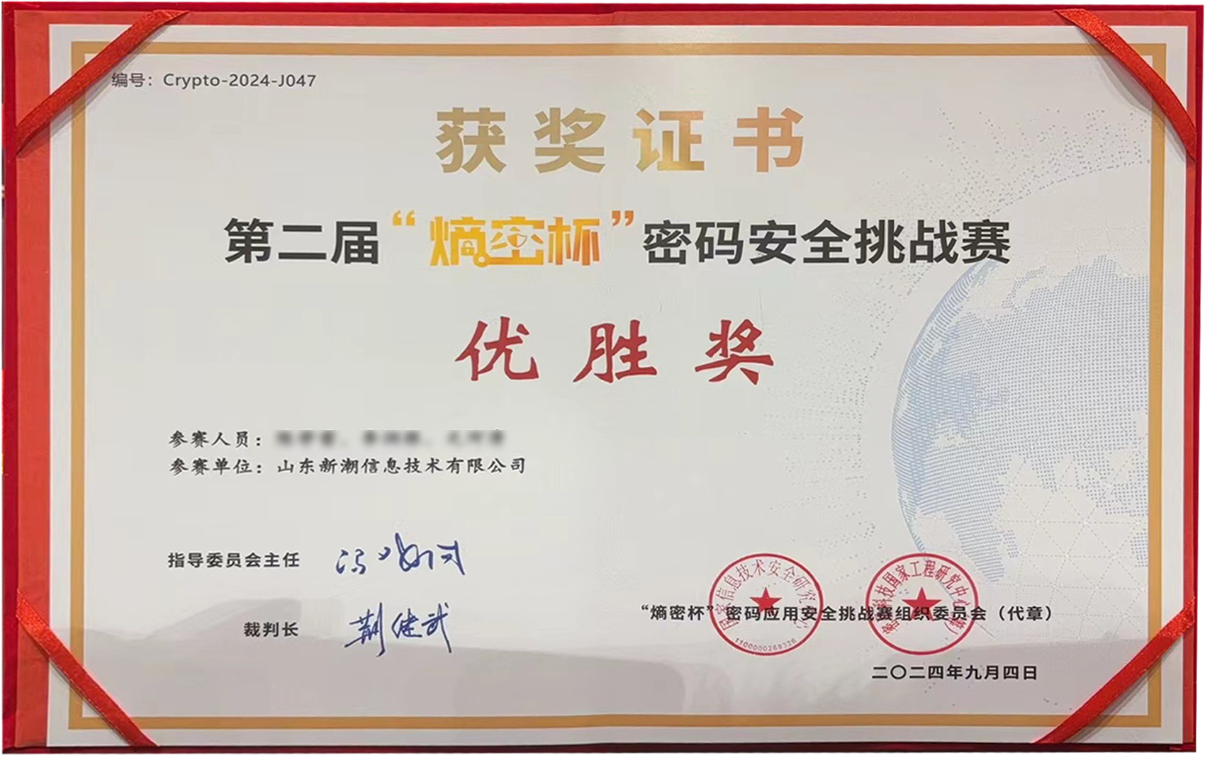 新潮信息組建的“迷蹤尋徑”戰(zhàn)隊(duì),榮獲本次大賽的“優(yōu)勝獎(jiǎng)”,展現(xiàn)了新潮信息在密碼領(lǐng)域的專業(yè)素養(yǎng)和綜合實(shí)力。