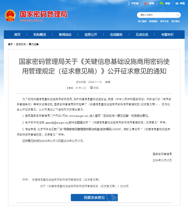 1.登錄國家密碼管理局門戶網(wǎng)站(網(wǎng)址:www.nca.gov.cn),進(jìn)入首頁“互動交流—意見征集”欄目提出意見。