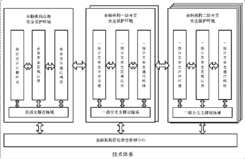 技術(shù)體系:參考《信息安全技術(shù) 信息系統(tǒng)等級保護安全設(shè)計技術(shù)要求》(GB/T 25070-2010)的安全域模型,將“安全域縱深防護”、“多層次立體防御” 和“信息安全等級保護”等安全防護思想相結(jié)合,建立金融行業(yè)信息安全保障技術(shù)體系模型。依據(jù)金融行業(yè)的組織結(jié)構(gòu)、網(wǎng)絡(luò)架構(gòu)將每個機構(gòu)作為一個整體保護對象,設(shè)計金融機構(gòu)信息安全保障框架,總部和各個分支機構(gòu)都是獨立的安全域,每個安全域又細分計算環(huán)境域、區(qū)域邊界、通信網(wǎng)絡(luò)和支撐設(shè)施域。