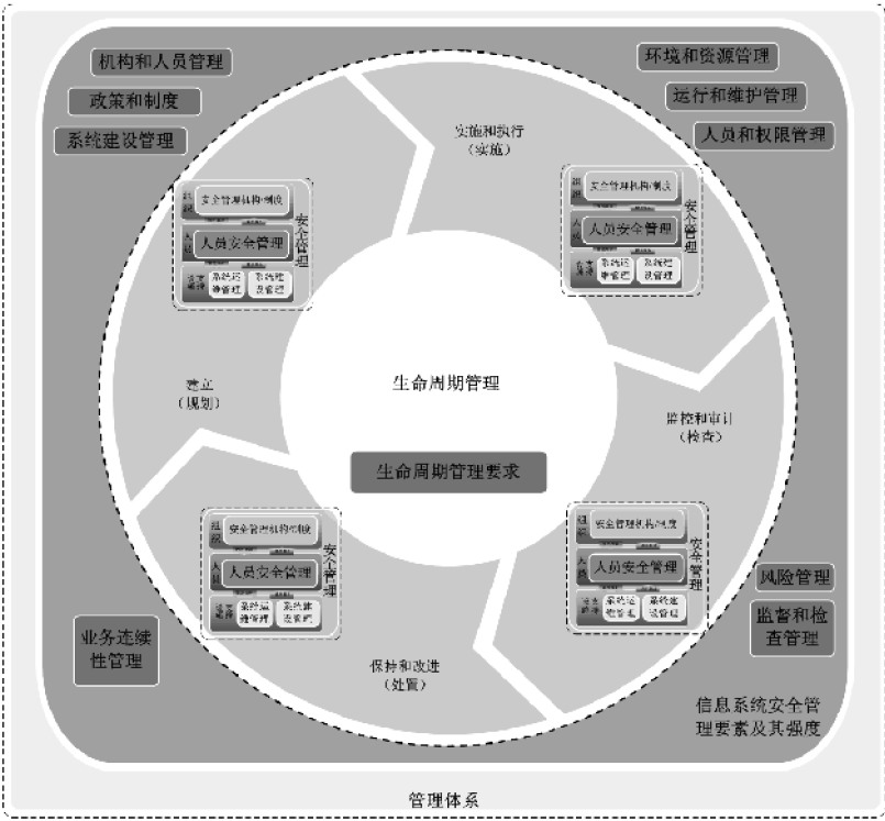 管理體系:要建成完善的安全管理體系,首先根據(jù)金融機構(gòu)信息化建設(shè)進程的實際需求,逐步建立起安全管理機構(gòu)、各項安全管理制度及人員配置;其次通過專職安全機構(gòu)、人員對制度的執(zhí)行,提高信息安全保障能力;后續(xù)根據(jù)執(zhí)行結(jié)果檢查各項制度存在的問題和缺陷;最后依據(jù)檢查結(jié)果對制度進行改進。從而形成建立、實施和執(zhí)行、監(jiān)控和審計、保持和改進的循環(huán)過程,形成完善的管理體系。
