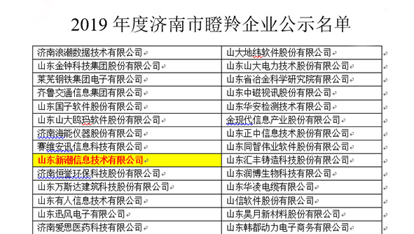 2019年8月,新潮信息被認(rèn)定為2019年度濟(jì)南市級瞪羚企業(yè)